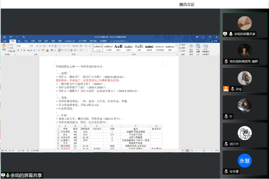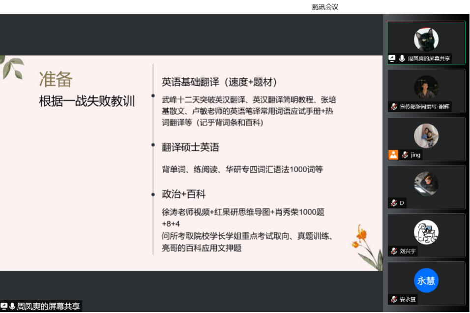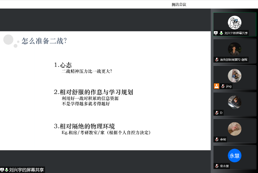 通过腾讯会议线上举办了二战考研经验分享会。本次经验分享会邀请到6位2015级、2017级的本科毕业生分享他们二战考研的心路历程、经验,以及考研失败后选择就业的方向思路,以此为考研失利的同学积累继续备考经验,同时,参考学姐们失利后多样化的就业选择路径,为本次考研失利的2018级同学们提供参考。