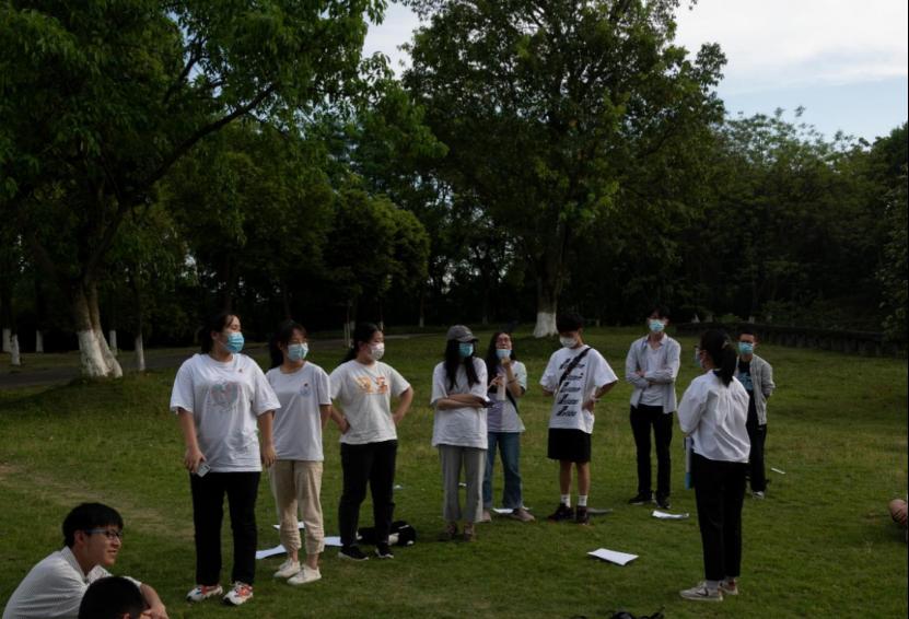 在室外活动的最后开展了关键词接龙游戏。主持人首先给每队展示一个有关共青团的关键词,队员们站成一排,依次用肢体语言传递关键词,由最后一人给出答案。同学们在愉快的游戏中加深了对团的理解。