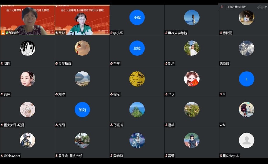 教授,主要研究方向为英语教学与英语教育技术、双语词典研究,出版词典、译注及教材40余部,发表论文30余篇。讲座中,邹晓玲教授首先简单介绍了云班课的主要功能,然后以实际课程为例深入浅出地分享了基于云班课的教学设计实例和教学管理经验,并为老师们提出了诸多实用的建议。同时,邹晓玲教授也与老师们一起交流了其近十年来在在线教学方面的研究与实践心得。