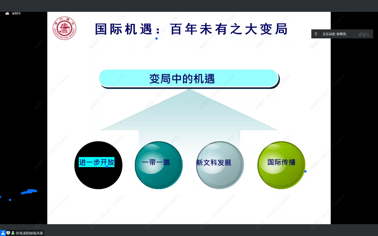 师生以及线上各高校师生就外语教育研究与教学的各类问题向彭教授求教,大家进行了热烈的线上讨论。彭教授的讲座内容丰富,磅礴大气,目光高远,既有前沿先锋,又有务实求真精神,对新时代背景下外语教学和研究发展具有强烈的现实意义。