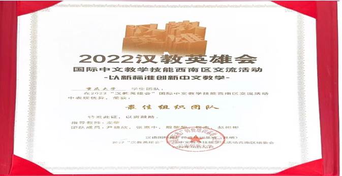 由我院龙藜副教授担任指导教师,带领汉硕20级英国归国志愿者尹婕欣、21级殷黎黎、权杰、张惠中和缅甸留学生赵彬彬5名学生组成团队加入了西南片区20支学生队伍交流,最终获得学生组“最佳组织团队”奖。