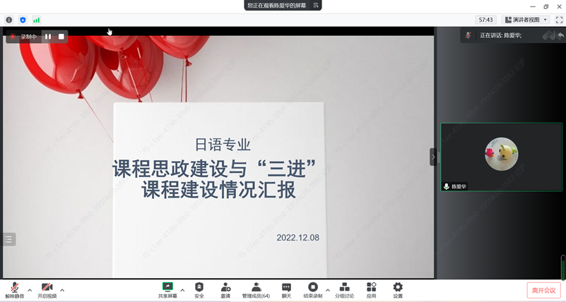 日语系以“课程思政建设暨‘三进’课程建设情况”为主题汇报了相关建设成果。陈爱华老师介绍了日语专业“三进”课程建设的建设目标、实施步骤以及课程设置基本原则。日语专业思政课程《理解当代中国》系列教材中对应课程为中心,以其他专业核心课程为辅助,将“三进”思想全面融入日语专业教学。目前日语专业有两门课程列入跳蛋视频
