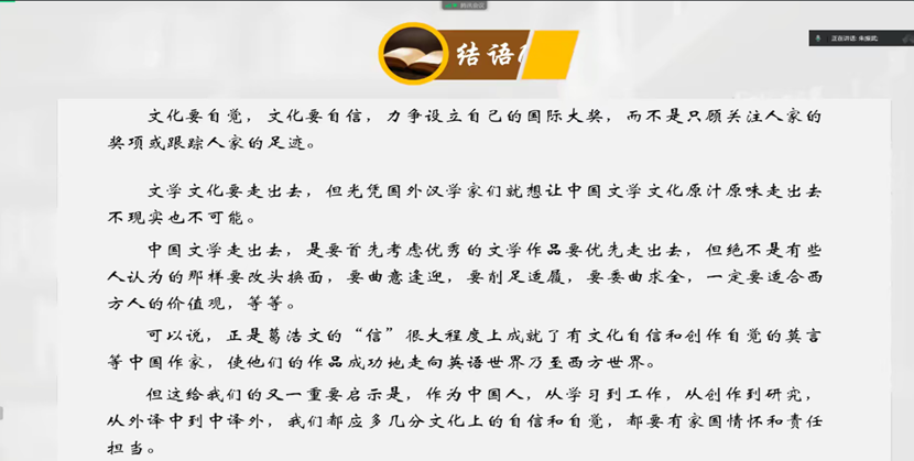 讲座过程中,朱振武教授反复强调外语人应在教学、创作和研究中形成跨界、跨学科思考的意识,培养文化自觉,牢固树立文化自信,怀揣家国情怀和文化担当,推动中国优秀的文学文化作品走出国门。