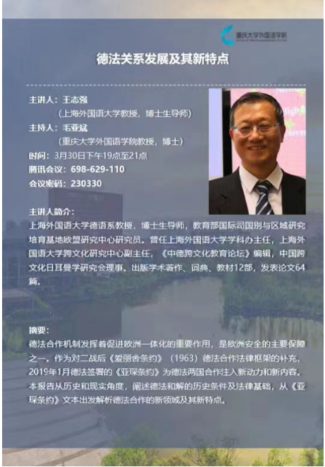 2023年3月30日晚,上海外国语大学教授、博导王志强老师为我院德语系生奉献了题为《德法关系发展及其新特点》的学术讲座。主讲人王志强教授系是教育部国际司国别与区域研究培育基地欧盟研究中心研究员,曾任上海外国语大学学科办主任,上海外国语大学跨文化研究中心副主任,《中德跨文化教育论坛》编辑,中国跨文化日耳曼研究会理事。出版学术著作、词典、教材12部,发表论文64篇。