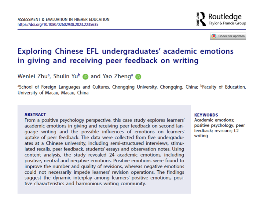 Wenlei Zhu, Shulin Yu & Yao Zheng (2023) Exploring Chinese EFL undergraduates’ academic emotions in giving and receiving peer feedback on writing, Assessment & Evaluation in Higher Education, DOI: 10.1080/02602938.2023.2235635