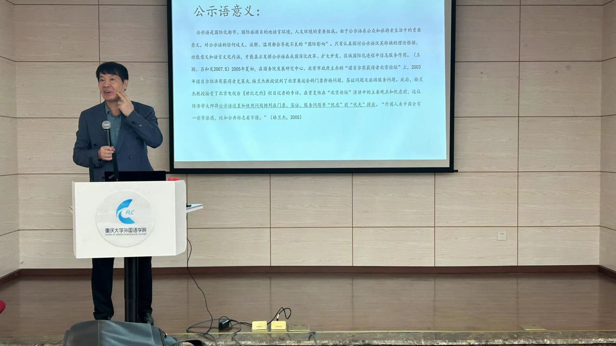 随后,谢教授分享了他在翻译新疆塔斯特景区和亚欧博览会等地的公示语时的经验。他强调,翻译过程是一种源文文化和译文文化互动和对接的过程,要求翻译者不仅精通语言,还要深刻理解文化背景。