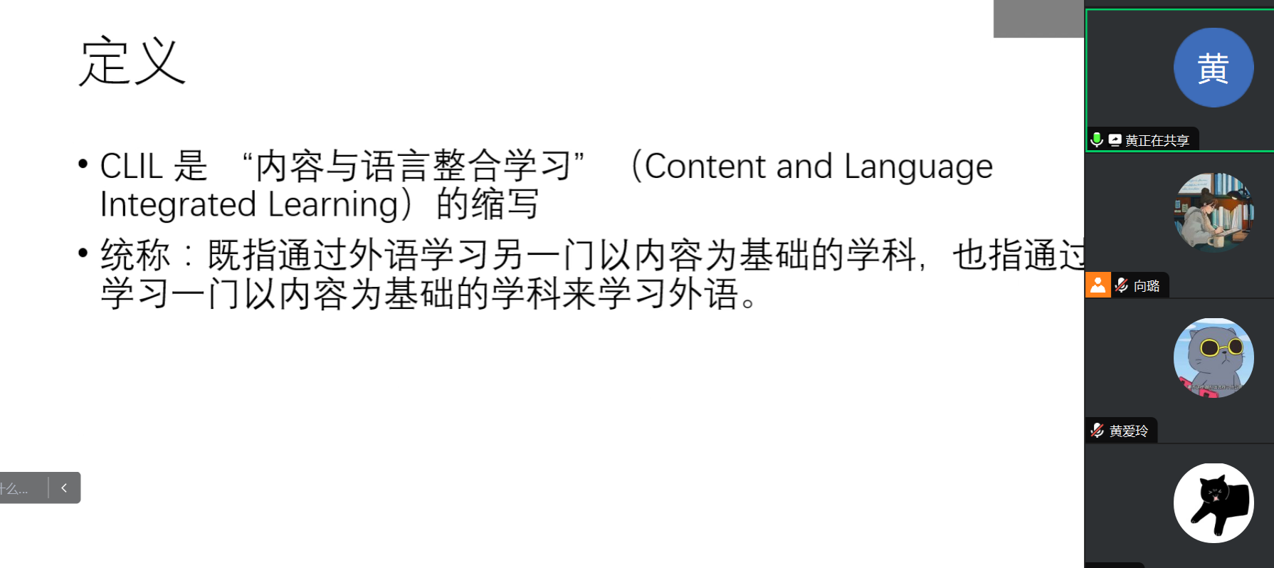 由于CLIL教学法要求教师有相应的学科背景,所以在实际教学过程中常会遇到师资团队教育背景多元化不足的问题,进而影响教学效果。研讨会的最后,郭萌老师、黄爱玲老师、毛亚斌老师及其他各位老师针对黄老师的分析论述表达了自己的观点,本次专题教学研讨会有利于德语系及德语语言文学文化教研室的教师不断提升自身的教学法认知水平,有意识的改进语言教学方法,提高教学效率,为今后培养方案和课程改革做准备。