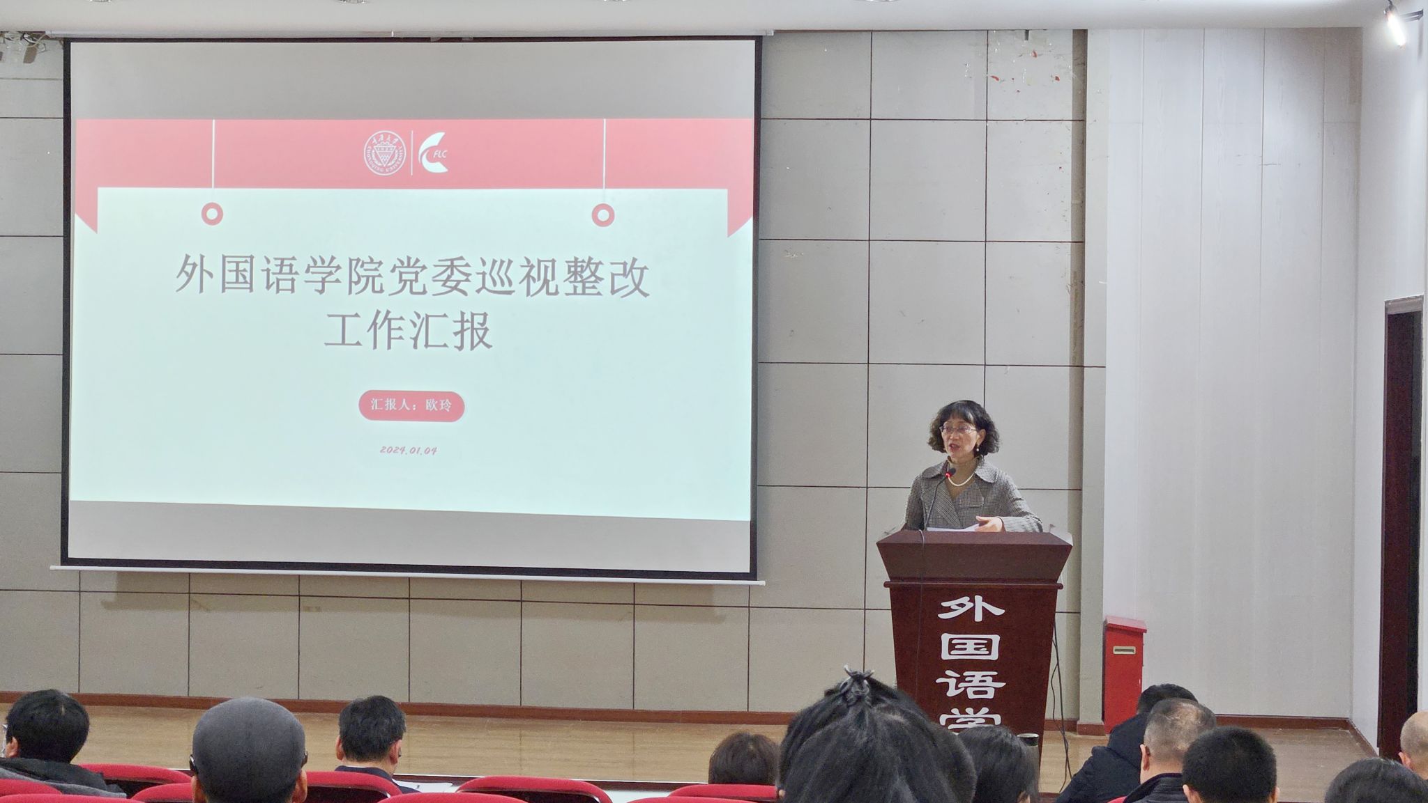 党委书记欧玲从基本情况、工作成效、不足和计划三个方面就2023年学院巡视整改工作进行了汇报。她从深入开展理论学习、增强学习贯彻实效,加强党政班子建设、发挥示范引领作用,深化落实“两个责任”、推进全面从严治党,强化基层党组织建设、发挥党员先锋模范作用,强化意识形态工作责任意识、健全意识形态风险防控机制等五个方面汇报了学院党委如何以强基赋能为抓手,进一步强化政治功能;从加强外语学科建设、推进专业内涵发展、加强校内外交流合作、积极探索新文科建设,落实立德树人根本任务、提高人才培养质量,加强教师队伍建设、提振教师群体精气神等四个方面汇报了学院党委如何聚焦国家重大战略需求,推动学院高质量发展。