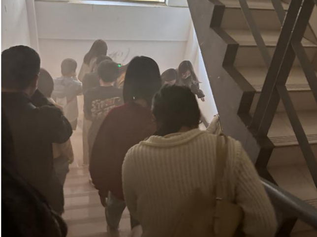 楼5楼模拟出“浓烟滚滚”的火灾场景,消防疏散广播迅速响起,消防控制室报警主机也发出刺耳的警报声。在志愿者的有序引导下,楼内的师生们迅速采取行动,弯腰低身、捂住口鼻,沿着安全通道快速而有序地撤离现场。