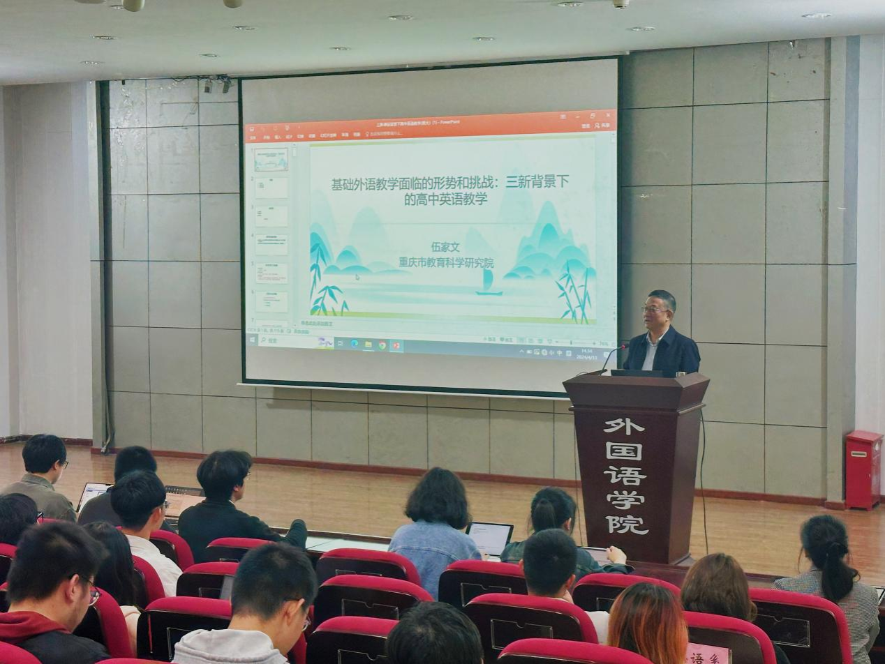 楼多功能厅开展了“名师讲坛”系列活动——基础外语教学面临的形势与挑战:三新背景下的外语教学研究讲座。讲座邀请了重庆市教育科学研究院高中英语教研员伍家文教授主讲,由跳蛋视频