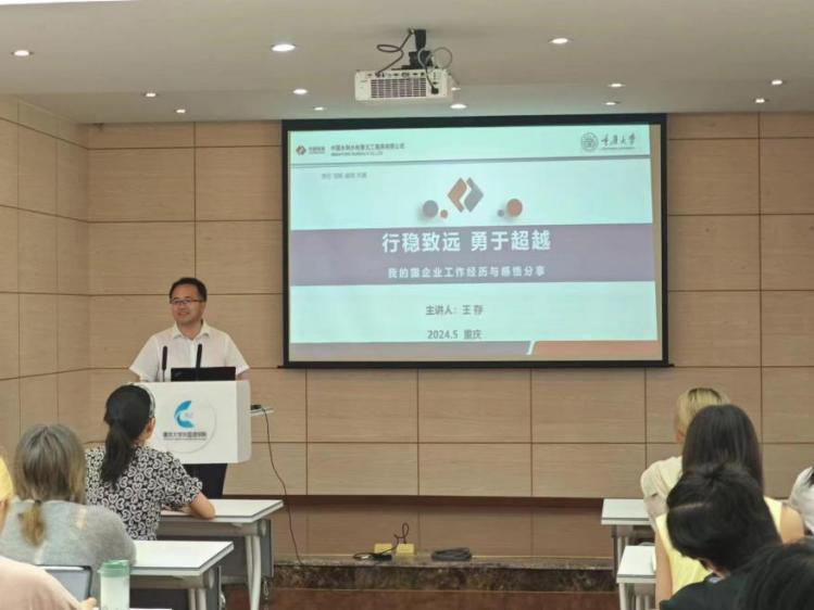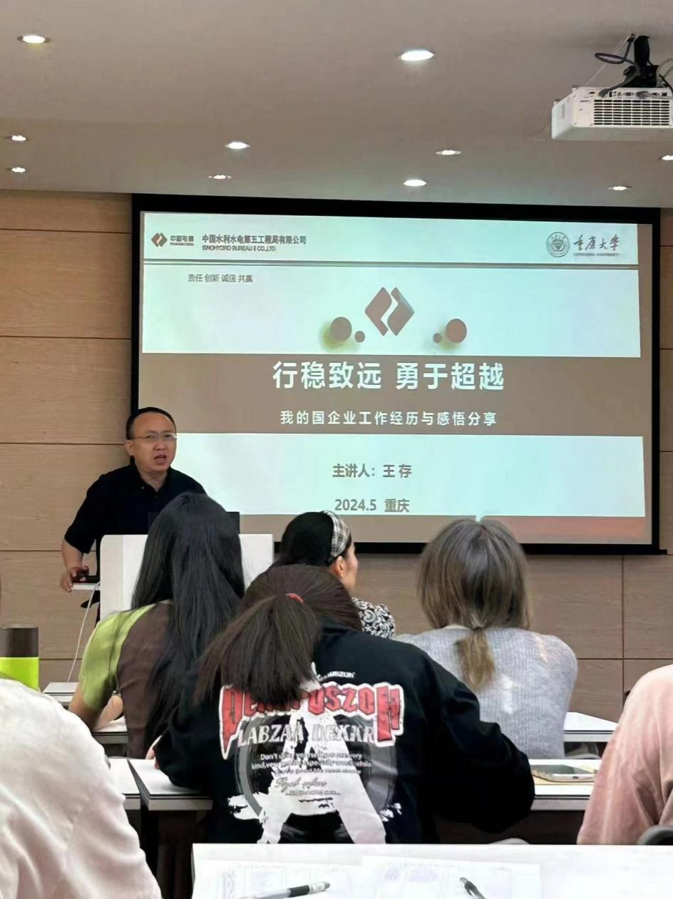 王存经理首先从个人和企业两个方面进行了介绍。他回顾了自己的历任岗位、工作经历和荣誉成就,并介绍了中国电力建设股份有限公司的市场布局、业务类型以及代表工程。通过他的介绍,现场师生对中国水利水电行业有了更加深入的了解。