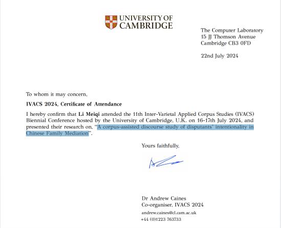 2024年7月16日至17日,第11届跨语言应用语料库研究双年会(The 11th Inter-Varietal Applied Corpus Studies Biennial Conference,简称IVACS)在英国剑桥大学成功举办。该会议是跨语言应用语料库研究协会组织的两年一度盛会,也是语料库语言学领域的重要国际会议之一,往届会议均在欧洲的世界名校举办。此次会议更是吸引了来自世界各知名大学、研究机构的百余位专家、学者参会,共同探讨语料库语言学的最新研究成果和发展趋势。我院蒋婷教授指导的2022级博士研究生李美奇参加了本次会议,并作学术发言。