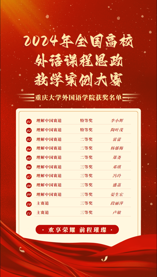 2024年9月10日,2024年全国高校外语课程思政教学案例大赛获奖名单揭晓,我院在此次大赛中表现出色,喜讯连连。其中,9人在理解当代中国赛道获奖,2人在主赛道获奖。