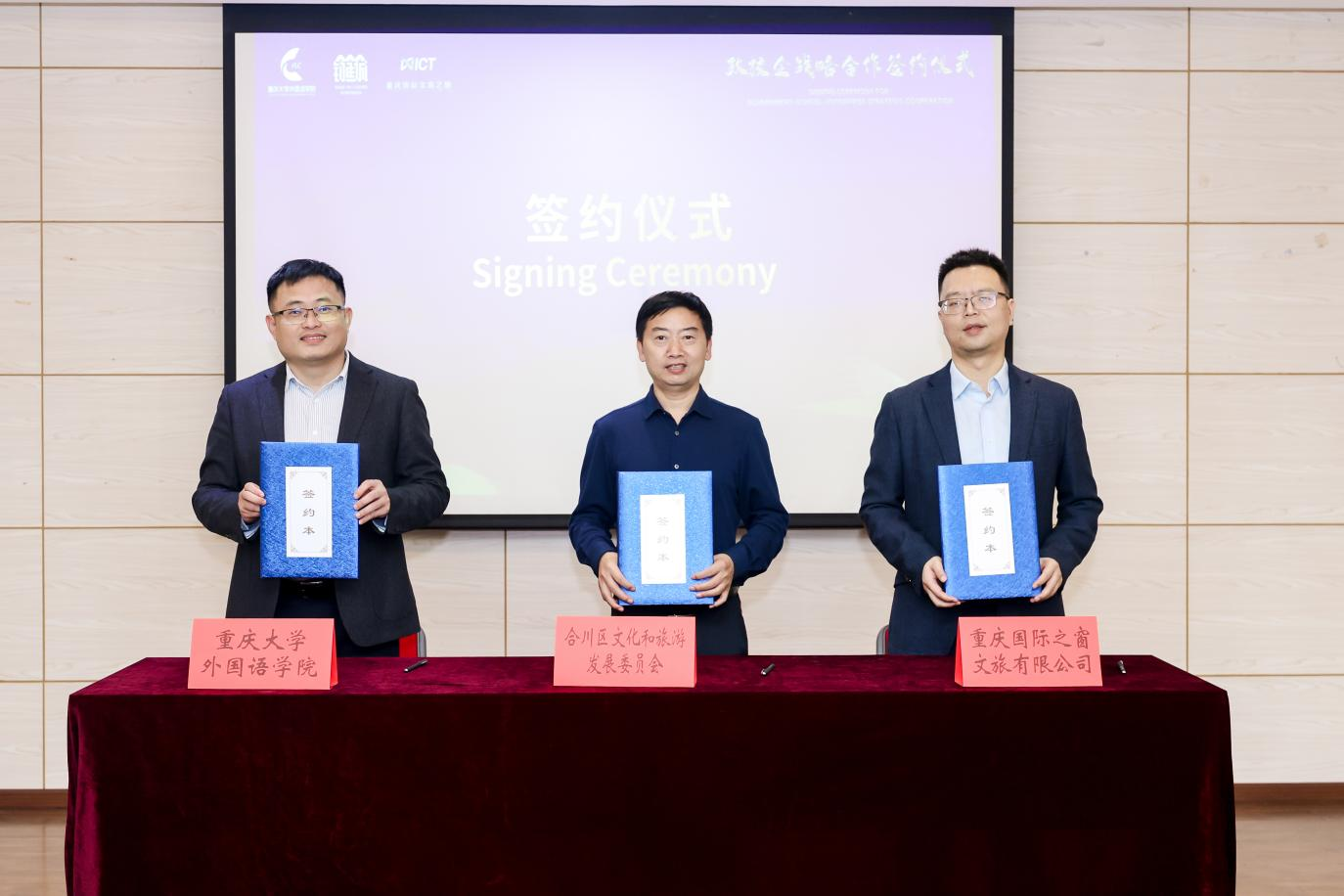 、重庆国际之窗文旅有限公司三方代表共同签署了战略合作协议,并为“国际青年文旅实践政校企合作基地”揭牌。