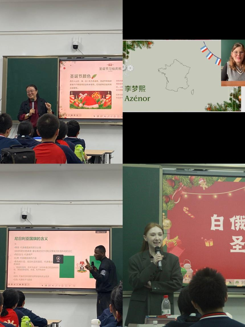 龙藜老师通过问题导入并运用了丰富的图片资料,为同学们描绘了圣诞节在全球的多样性。随后,几位留学生逐一上台,用他们的视角和亲身经历,讲述了各自国家的圣诞习俗和趣闻。李梦熙同学带大家领略了法国圣诞的习俗与美食,琳娜同学分享了白俄罗斯东正教独具特色的圣诞文化,而张瀚文同学则以尼日利亚伊博族的视角,展现了内容丰富的圣诞节庆典。