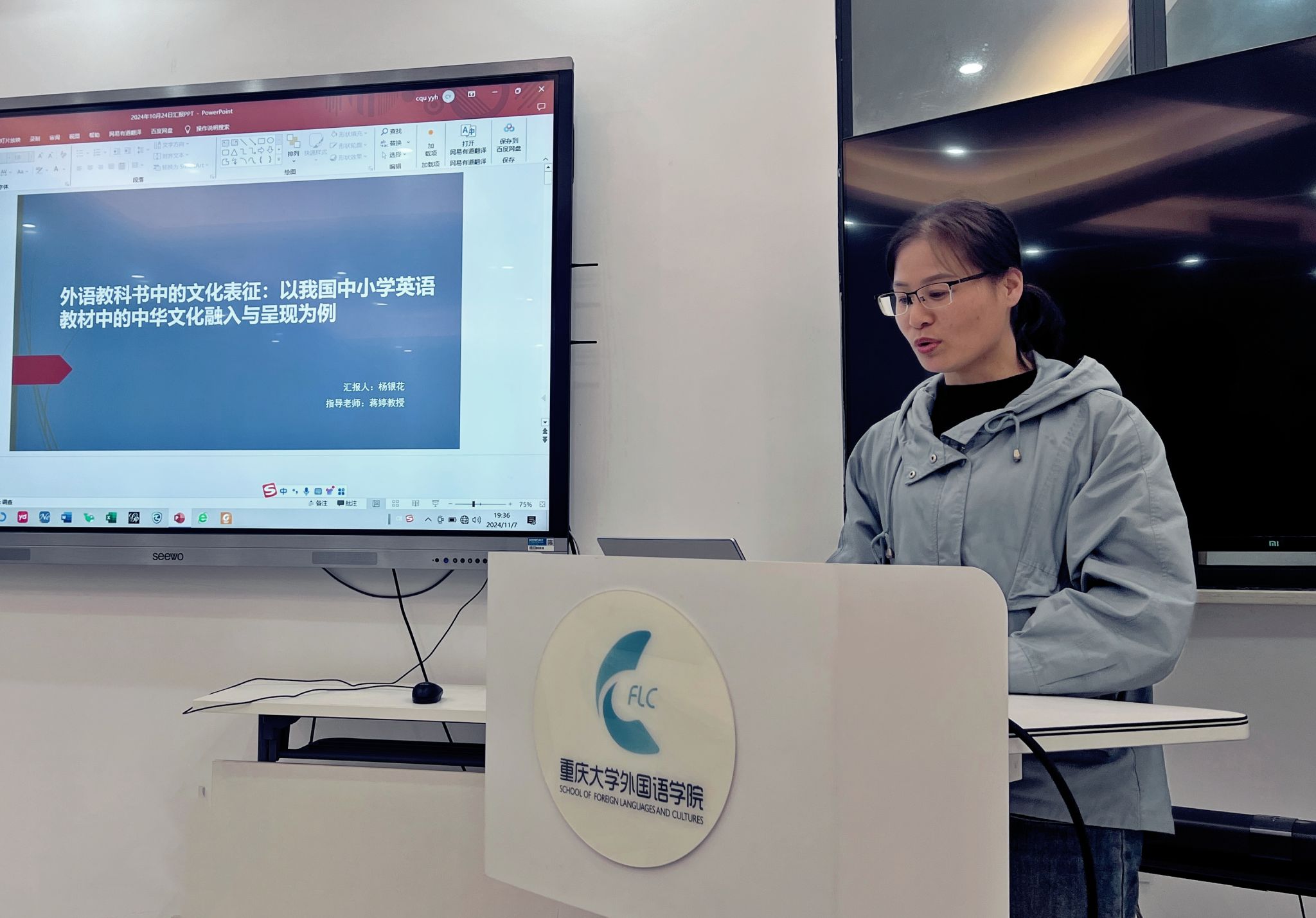 蒋婷老师团队的博士生杨银花同学,发言主题为“外语教科书中的文化表征:以我国中小学英语教材中的中华文化融入与呈现为例”,这也是她重庆市研究生科研创新项目的阶段性成果。通过她的实证研究,从理论框架到我国中小学教材中文化表征的现状,以及对教材编写的反思与建议,老师和同学们都得到了很多启发。