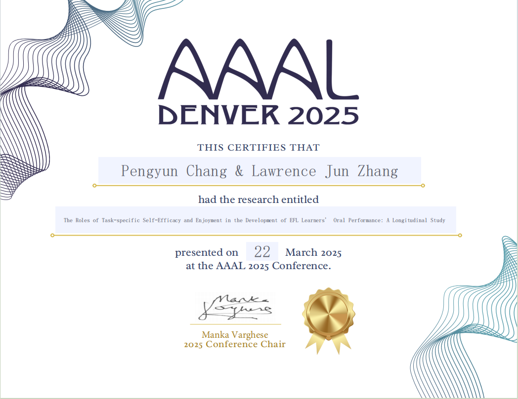 常鹏云博士于2025年3月20日至27日赴美国丹佛参加2025年美国应用语言学年会(AAAL),并在由李成陈教授(上海交通大学)与Prof. Shaofeng Li(The Hong Kong Polytechnic University)教授主持的“Individual Differences and Task-Based Language Teaching: Theory, Research, and Practice”专题论坛中发言。发言题目为“The Roles of Task-specific Self-Efficacy and Enjoyment in the Development of EFL Learners’ Oral Performance: A Longitudinal Study”,该成果于2024年11月发表在语言学国际期刊System第127期,论文第一作者为常鹏云,第二作者为跳蛋视频