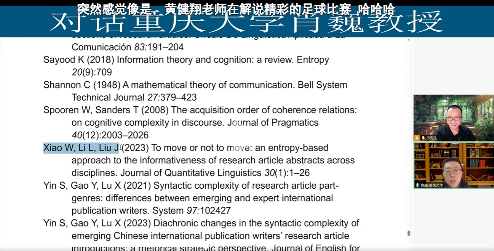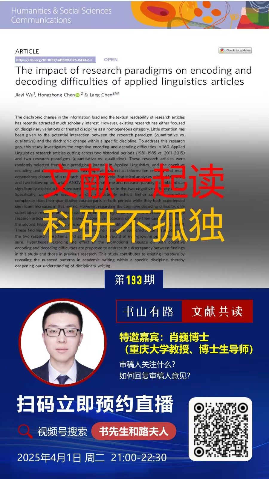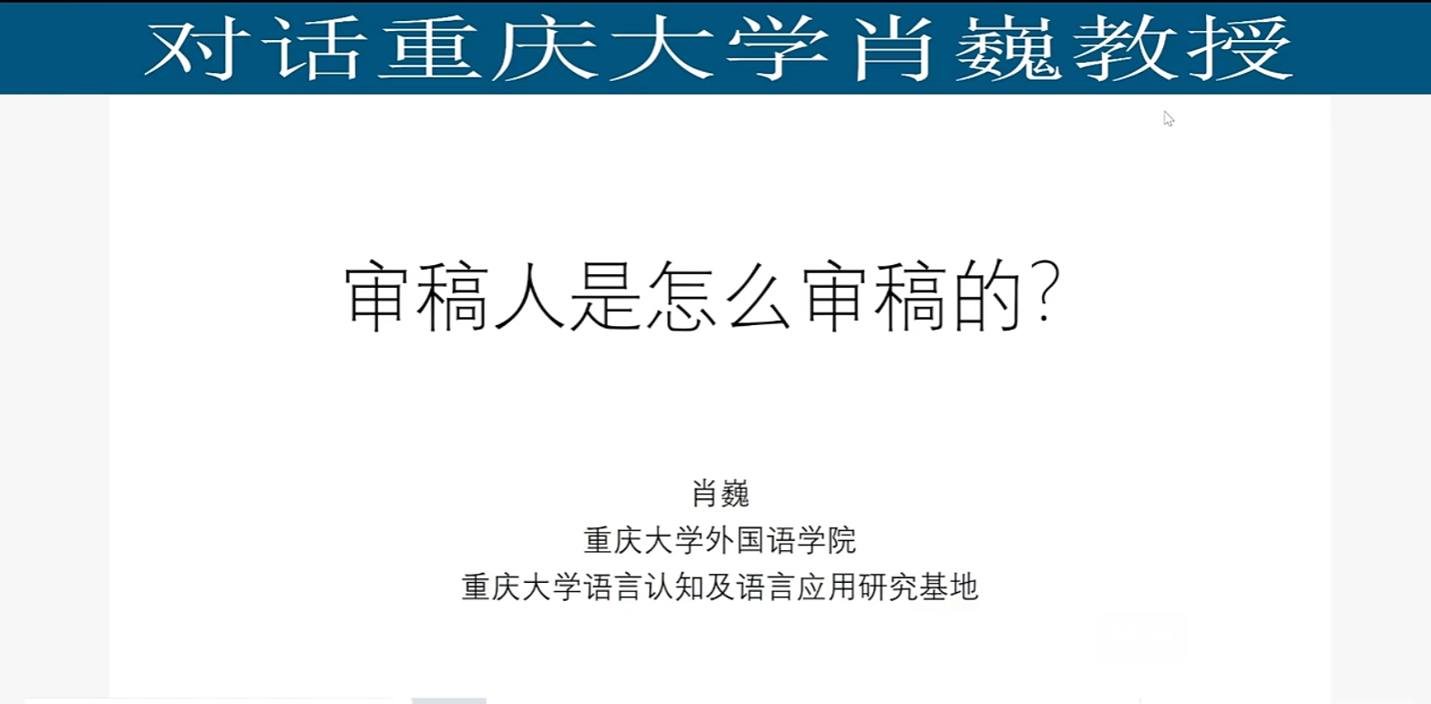 博士生导师、语言认知及语言应用研究基地专职研究员肖巍教授在微信视频号作了公益讲座“审稿人是怎么审稿的”。讲座由新加坡南洋理工大学Lang Chen博士主持。1700多人在线观看了讲座。