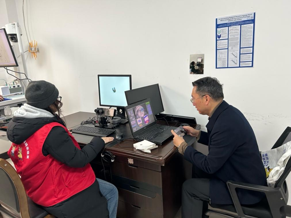 在脑电实验室,委员们观摩了脑电设备实时监测语言处理神经机制的过程:当志愿者完成认知任务时,设备同步呈现其脑电信号。移步至近红外光学成像实验室,领导们见证了如何通过检测大脑血液中氧合血红蛋白和脱氧血红蛋白浓度的变化来反映语音信号加工过程中大脑活动。通过Eyelink和Tobii眼动仪,领导们见证了设备如何精准追踪眼睛的运动轨迹、注视点和注视时间等参数,这些参数揭示了人们在语言产出和学习过程中的注意力分配和信息加工模式。