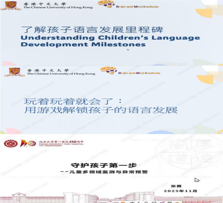 首场讲座由香港中文大学语言治疗师尹慧倩主讲"了解孩子语言发展里程碑",系统讲解0-3岁儿童语言发展特征,解析语言能力对学习社交的影响,强调早期识别发展警示信号及家庭互动的重要性。第二场尹老师以"玩着玩着就会了"为主题,介绍适龄玩具与游戏类型,分享观察等待等实用技巧,帮助家长在日常生活中有效引导孩子。第三场由北京大学第一医院张茜治疗师主讲"守护成长第一步",聚焦儿童发育监测与异常预警,解读孤独症等发育障碍的早期信号,强调早发现、早干预的重要性。
