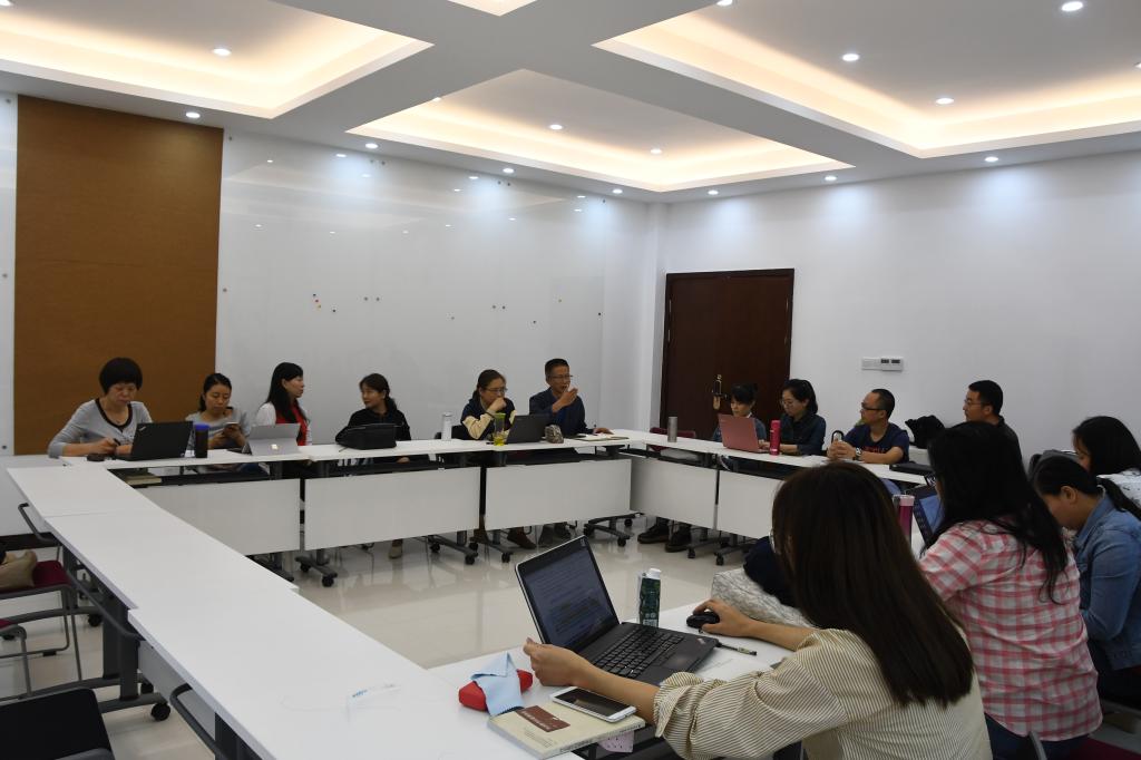 2018年9月14日上午,由邹晓玲教授领衔的外语教育技术研究室开展了本学期第一期专题工作坊,针对老师们在教学研究中遇到的研究方法和数据分析等问题进行专题讨论。工作坊由邹晓玲教授主持,欧玲书记、李小辉副院长等学院20余名老师参加了此次工作坊。
