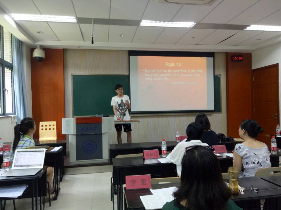 6月28号下午14:00,公外研究生演讲大赛就开始紧锣密鼓地进行选手报到及抽签出场的准备工作。公外研究生课程组的各位老师为顺利开展此次演讲比赛,大力支持与鼓励同学们积极参与踊跃报名。经过视频初赛的筛选,最终16名选手进入决赛。14:30,由英语专业研究生徐帅同学主持,演讲比赛正式拉开帷幕。比赛分为定题演讲和即兴演讲两个环节,在为时近2个小时的比赛中, 现场气氛紧张而热烈,参赛选手们语言标准流利,演讲内容清楚明确,演讲风格生动鲜明。经过选手们激烈的角逐与评审老师们专业的评选,来自计算机学院的李俊杰同学获得特等奖;经管学院的成果垒,化学化工学院的尹思力两位同学获得一等奖;温蕊,黄彪,陆鹏三位同学获得二等奖;王梓等四名同学获得三等奖;优胜奖由李孟泽等六位同学获得。此次演讲大赛由外语学院公外研究生课程组的陈晓莉,黄赟琳,向朝红,李雁,黄颖,邹远鹏六位老师组成专业的评审团队参与评审,体现了公开、公平、公正的原则。另外,研究生院助教团队牟佳星等同学积极参与协助本次演讲比赛,充分展现了跳蛋视频