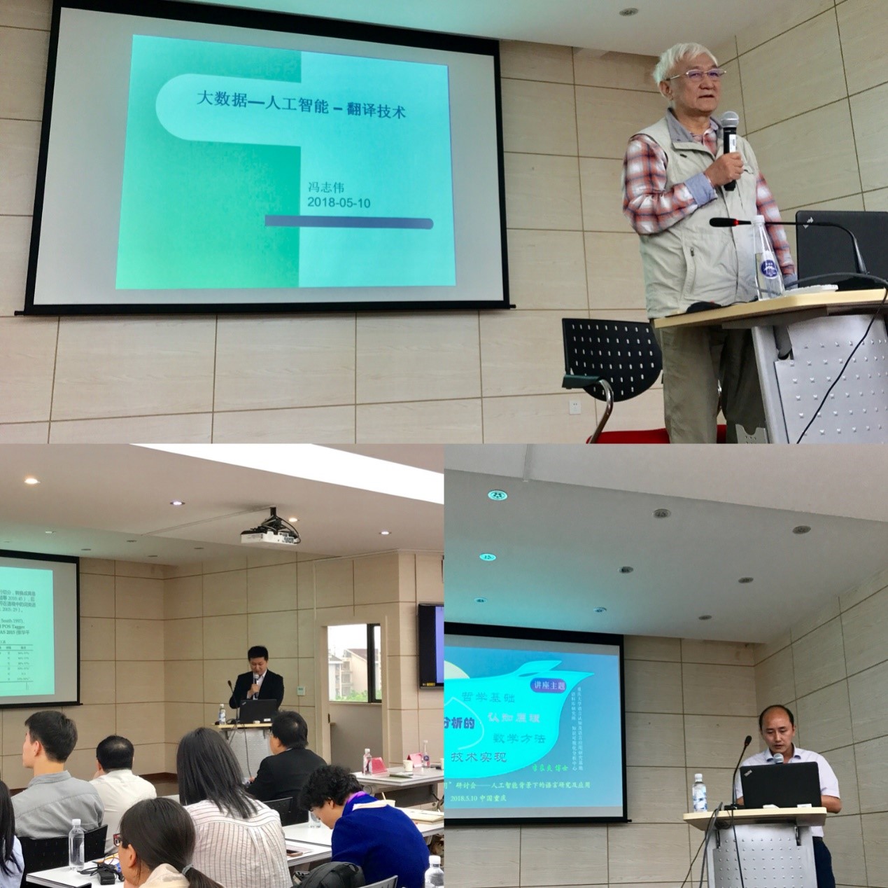 杨小虎副院长首先致辞,热烈欢迎从全国各地远道而来的各位专家学者。接着,由国内人工智能和语言研究领域的知名专家冯志伟教授做了题为“大数据——人工智能——翻译技术”的讲座,由基地主任辜向东教授主持。冯教授结合自己的国内外求学与翻译研究经历追溯了机器翻译与人工智能的发展历史,指出随着大数据时代的来临,国内翻译市场能力严重不足的现状,并认为机器翻译现今无法全面取代人工翻译,人们不必过多担心翻译职业的消失。冯教授还屡次强调跨学科的重要性,只有具备了跨学科意识,学术研究之路才能越走越宽。