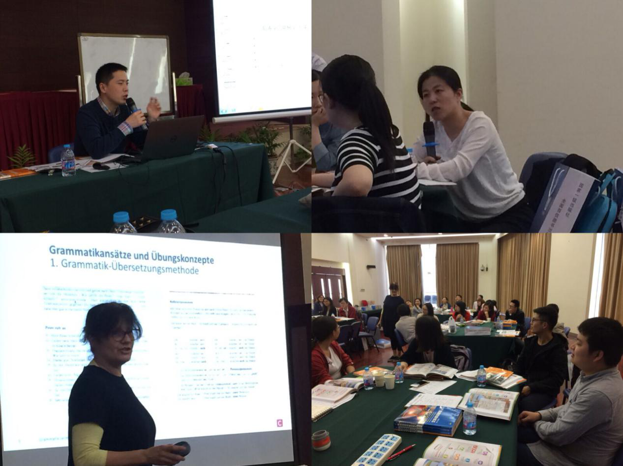 4月21日,德语系黄俊老师在上海外国语大学中国外语教材与教法研究中心参加了以德语交际教学为主题的系列研讨会。会议邀请了歌德学院上海语言学习中心拜敬女士、同济大学留德预备部张剑平先生以及德国康乃馨教育出版集团教学法专家Martina Bartucz女士作为嘉宾,与来自全国各类院校的40余名德语教师们围绕“数字化时代网络媒体支持的德语交际教学法”进行了互动讨论。