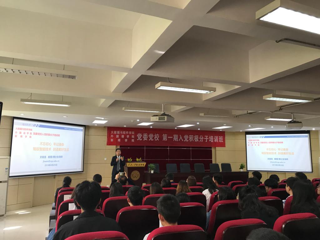 随后,大数据与软件学院党委委员、副院长文俊浩教授,为学员们上了本期培训的第一课。文俊浩教授以“不忘初心,牢记使命,驾驭智能技术,创造美好生活”为题,紧扣党的十九大报告中的“智能化”方针,从国家战略,人工智能,智慧重庆等多个层次为学员们进行讲解,以深入浅出的方式,结合政治、经济、社会等维度,使学员们更加深刻认识到党的十九大精神实质。同时,文教授还从语言认知,自动写作等多个方面,将软件、外语、新闻的相关知识联系起来,让学员们认识到了专业间的融会贯通。