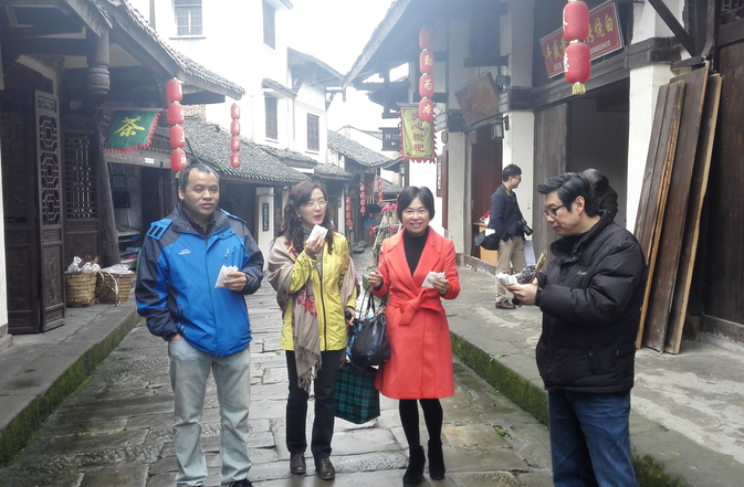 院工会组织教职工及家属小孩一行于蒙蒙春雨中踏上寻春探野之旅。上午十时许,队伍来到此行的第一站——丰盛古镇。古镇石街蜿蜒,因数代人的彳亍而磨光的石面上春雨润透,拉近了行人和先人的时空距离;街边林立着明清遗楼,青砖黑瓦,挑檐雕窗;古镇周围,山势嵯峨。此时春雨初歇,停云蔼蔼,远山如黛,近水含烟。