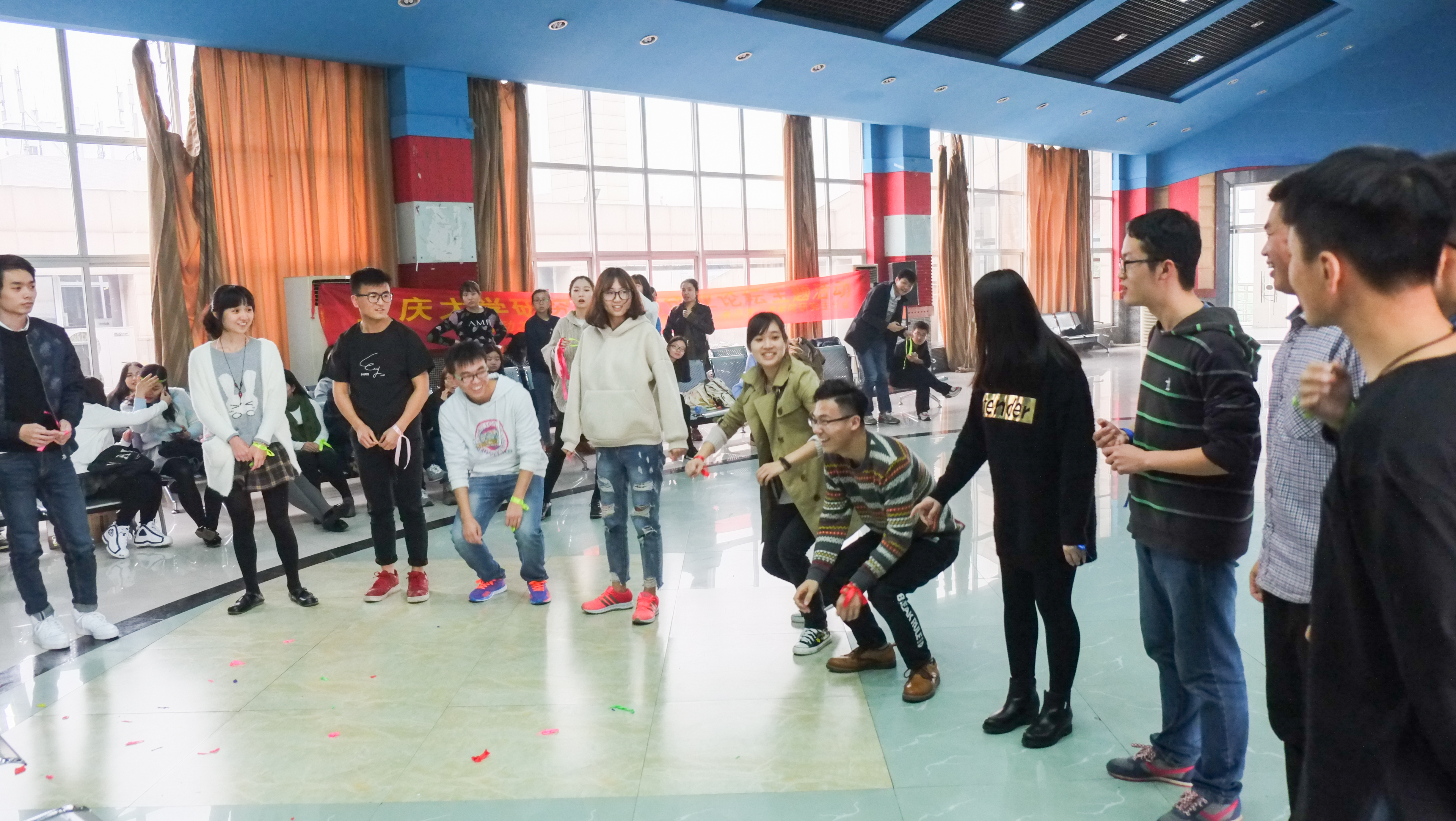 的同学们被随机分成十个小组。每组成员确定了各自的队长、队名和口号,便于参与游戏环节。活动中依次进行了“心心相印”、“夹气球跑”、“正话反说”、“萝卜蹲”和“踩气球”五个游戏项目。每个团队在各比赛中累计加分,最终获得物质奖品,包括书立,笔记本,盒装牛奶、明信片和笔等。外语女生和软件男生搭档,组建成队,互相取长补短,使游戏场面热火朝天,气氛高涨。