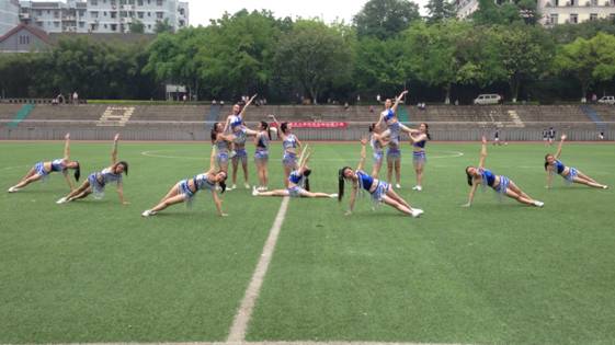 的队员们在初赛中,就以整齐划一的动作,自信昂扬的面貌赢取了不少关注。决赛的自选操,他们除了继续延续精益求精的特点,还在动作和队形上进行了提升创新,表演难度大大提高。“外院外院!活力无限!一、二、三、 GO!”高亢响亮的口号,给赛场注入一剂“强心剂”。音乐响起,两位女队员漂亮利落的连续空翻赢得了场下观众热烈的掌声。动感的节奏,整齐的动作,十六位队员带着自信的微笑,如同激情绽放的蓝色火焰,点燃了整个赛场。多样的队形变换,高抬腿,劈叉,下腰等各种高难度动作,被她们用最热情到位的动作演绎得精妙绝伦。队员们默契的配合,舞动的身姿手腕飘扬的蓝丝带,吸引着每一个观众。完美谢幕动作赢得了满堂喝彩,十六位女孩灿如暖阳的笑颜也被定格为最美瞬间。