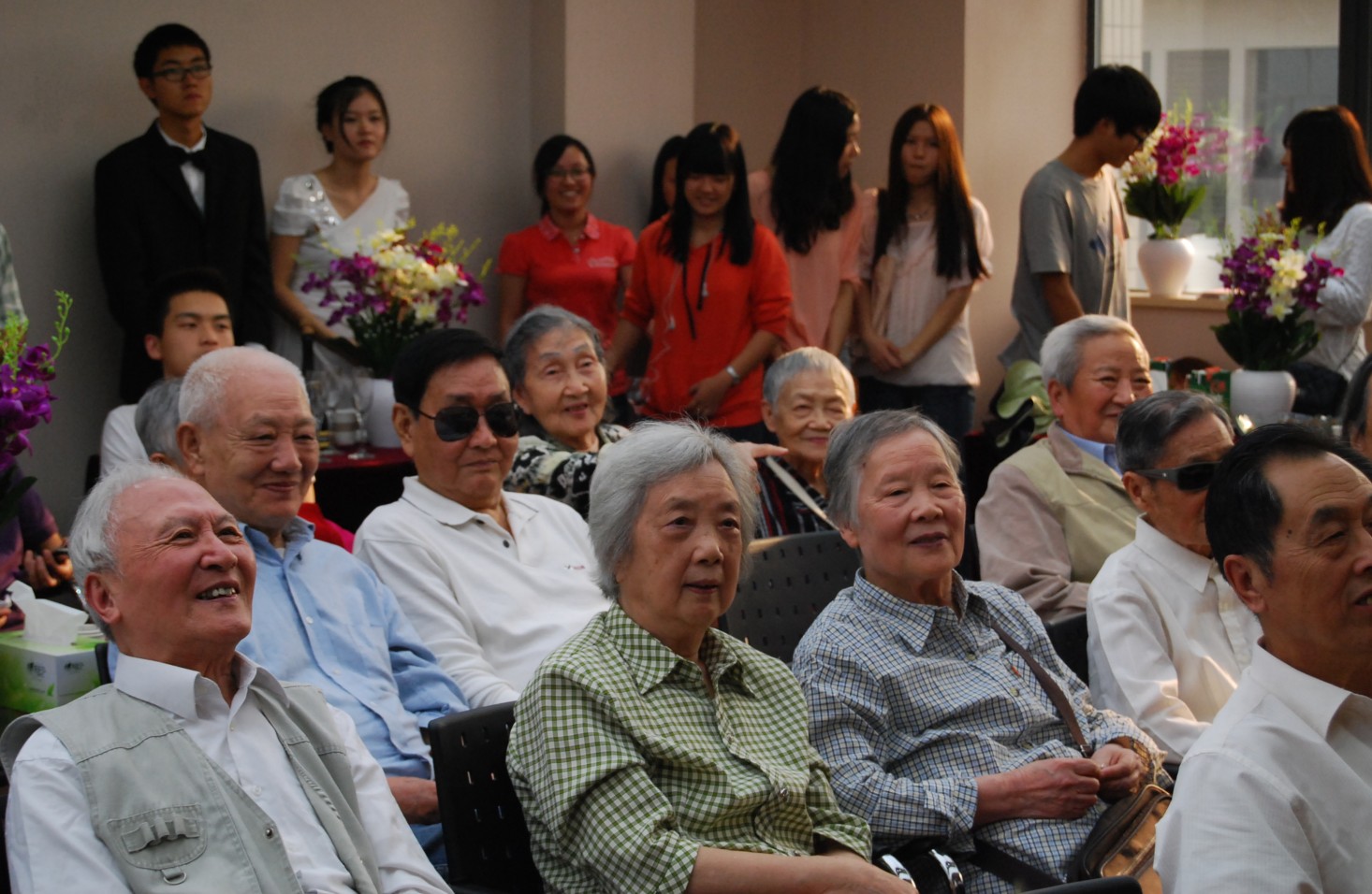 活动分为座谈会和参观虎溪校园两个部分。座谈会在学院新投入使用的学术报告厅中进行,十名英俊靓丽的礼仪,二十余名青春洋溢的学生志愿者,为整个会场带来了一股青春活力的气息。组织学生志愿者在活动过程中协助照顾参会的老同志,能够更好的照顾到老同志的安全,这是学院在类似活动组织上的一次创新。