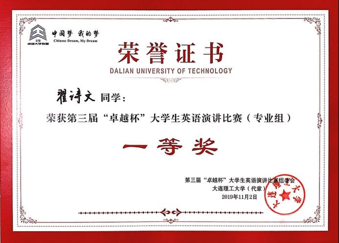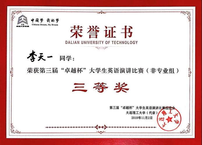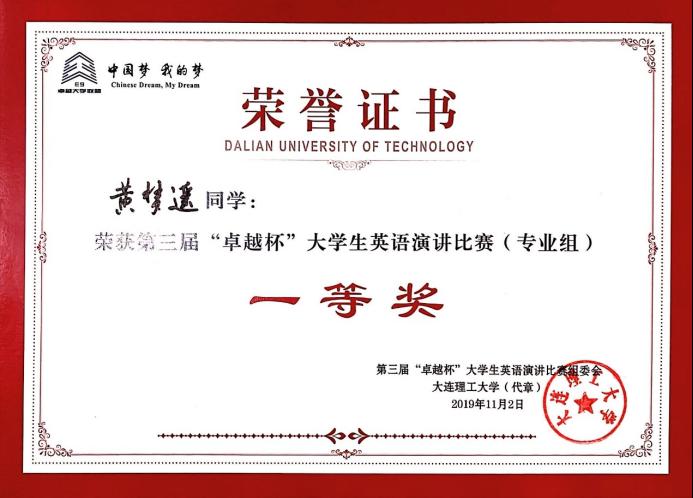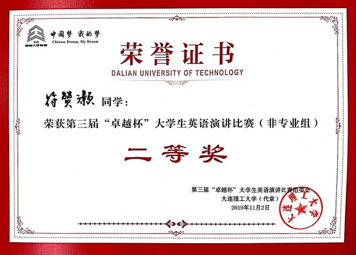 2019级黄梦遥同学和2018级翟诗文同学在第三届“卓越杯”大学生英语演讲比赛中荣获一等奖,UC联合学院2017级符赞灏同学荣获二等奖,电气工程学院2019级李天一同学荣获三等奖。本次卓越大学联盟第三届“卓越杯”大学生英语演讲比赛复决赛在大连理工大学举办,跳蛋视频