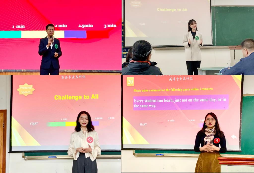的各位选手在“Challenge to All”的定题演讲中,展现出自己强大的说理论述能力与知识储备,或以时事热点为出发点,或例举名人轶事,或结合专业领域,围绕如何直面问题、迎接挑战等方面展开演讲,掷地有声地来表达自己的态度。在以名言名句为话题的即兴演讲中,他们各展其才,从不同角度有新意、有深度地扣题阐述,让人眼前一亮。面对犹未可知的两个外教提问,选手们更是不惧挑战,凭借扎实的语言应用功底、标准的发音以及机智敏锐的回答,赢得满堂彩。