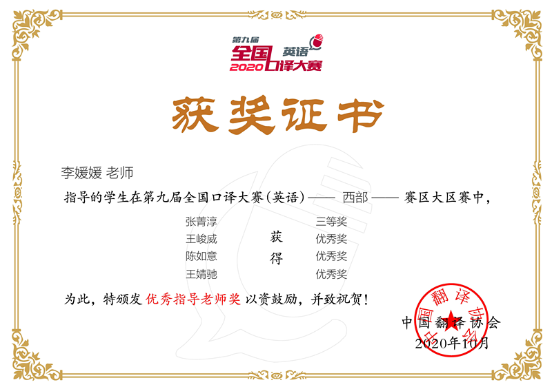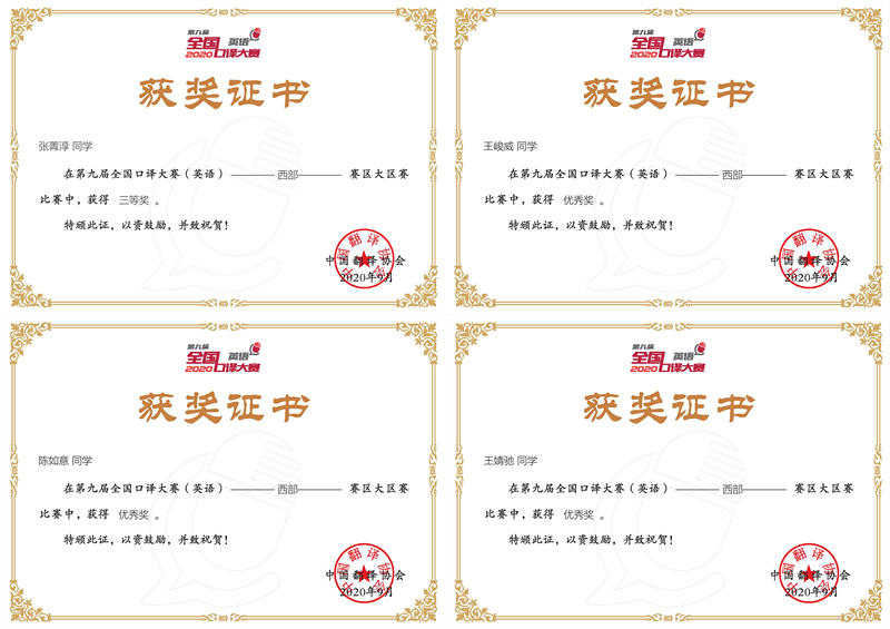 几位选手在大区赛上稳定发挥,取得了可喜的成绩。2017级英语专业本科生张菁淳获得三等奖,2017级英语专业本科生陈如意、2017级德语专业本科生王峻威、2017级英语专业本科生王婧驰等3人获优秀奖。