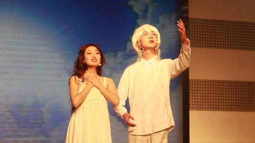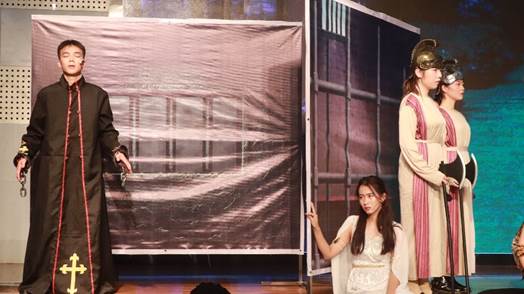 日语剧目是融汇东西方元素的剧场之星。正如日语专业致力于造就复语人才的培养方案一样,日语剧《伊丽莎白》由德语剧目改编而来,撞出了东西方融合的艺术花火。相较于初赛的生疏与青涩,在决赛中,演员们激情四射的表演与吟唱,营造出了诡谲又奇妙的剧场氛围,让观众沉浸其中,掌声不断。