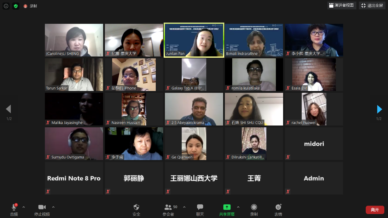 李小辉副院长代表学院致辞,介绍了开放科学对教学和科研的重要意义,以及学院组织开展本系列讲座的主旨和目的。本期讲座由约克大学教育系语言学习与应用研究中心副主任Dr.BimaliIndrarathne主讲,分享了基于英国约克大学“应对全球挑战基金研究项目“开展的“通过教师参与、改变南亚国家英语学习资源匮乏现状”研究专项。该项目研究如何与孟加拉国、尼泊尔、巴基斯坦和斯里兰卡等南亚国家的英语专家和教师培训人士合作,利用约克大学主导的OASIS”语言研究概要开放资源库“来设计英语教学材料,以及项目的成果。来自近十个国家的外语教师或者研究者参加了研讨。
