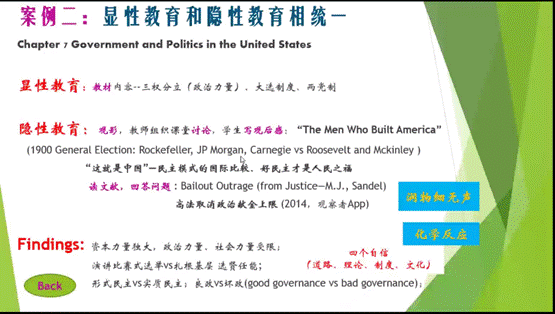 方玲老师在《中美文化比较》课程中也进行了很好的课程思政探索。她分享的主题为“从全球视野到文化自信----构建课程思政教学模式”,从“课程思政建设的误区”到“课程思政建设途径”,从大量当下的案例分析,再到学生“四个自信”的培养,方老师把教学与课程思政融为一体,获得学生的高度评价。