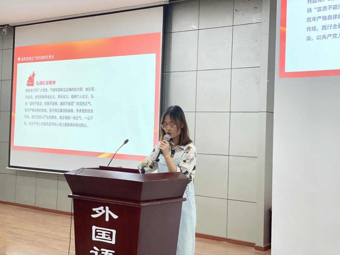 紧接着,由环境与生态学院的孙彩平同学进行关于红岩精神的演讲。她提到当代青年要在学思践悟中坚定理想信念,在奋发有为中践行初心使命。弘扬红岩精神,要继承和发扬老一辈革命家立党为公、执政为民的革命情怀以及“功成不必在我”的精神境界、“功成必定有我”的历史担当。鼓励同学们要培养浩然正气、担当时代责任。
