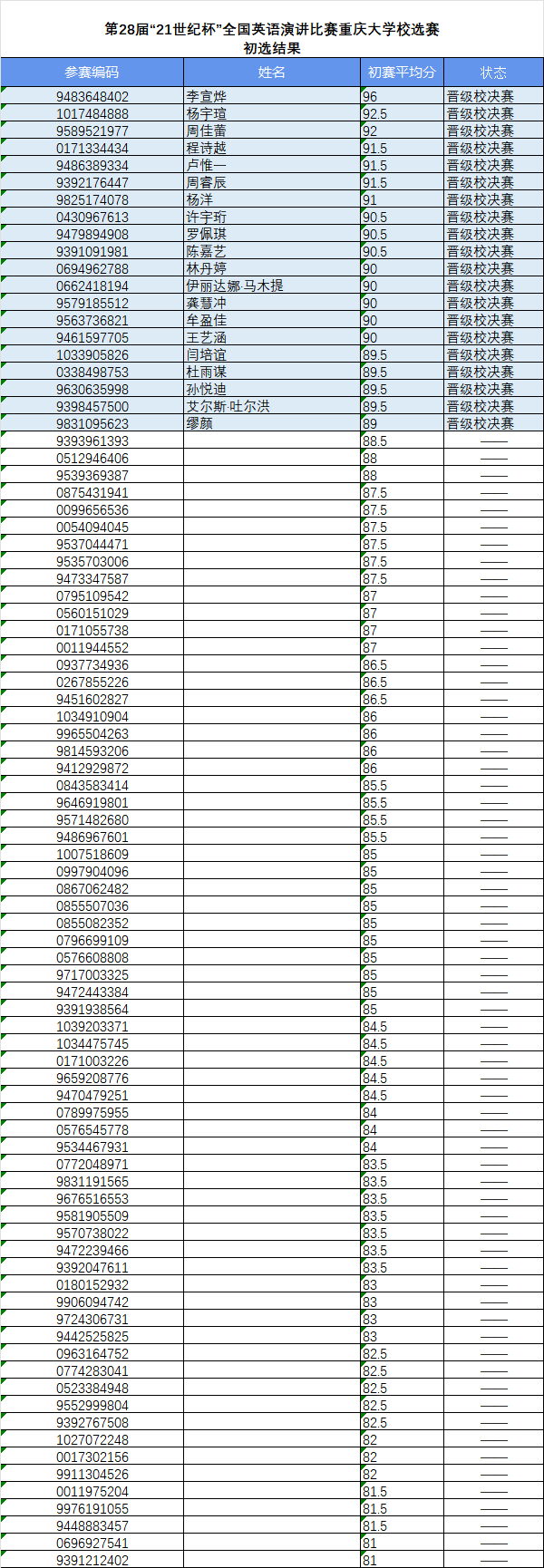 经报名资格初审、评委评定,现将第28届“21世纪杯”全国英语演讲比赛跳蛋视频 校选赛初选结果及晋级校决赛名单公布如下。其他相关事宜,请选手在校初赛、校决赛群内获取。