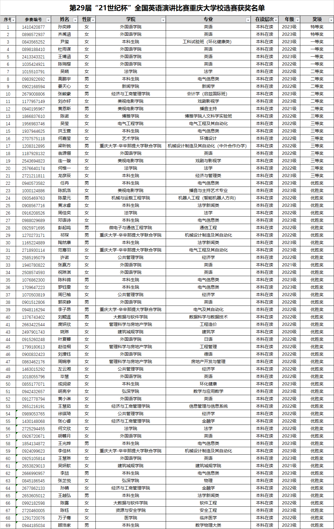 第29届“21世纪杯”全国英语演讲比赛跳蛋视频 校选赛自发布通知起,吸引了全校23个学院50多个专业上百名同学报名参赛,98名选手审核成为正式选手。大赛历时近一个月,选拔评定出2名特等奖、4名一等奖、6名二等奖、9名三等奖、47名优胜奖。现将获奖名单公布(也可查看附件)如下: