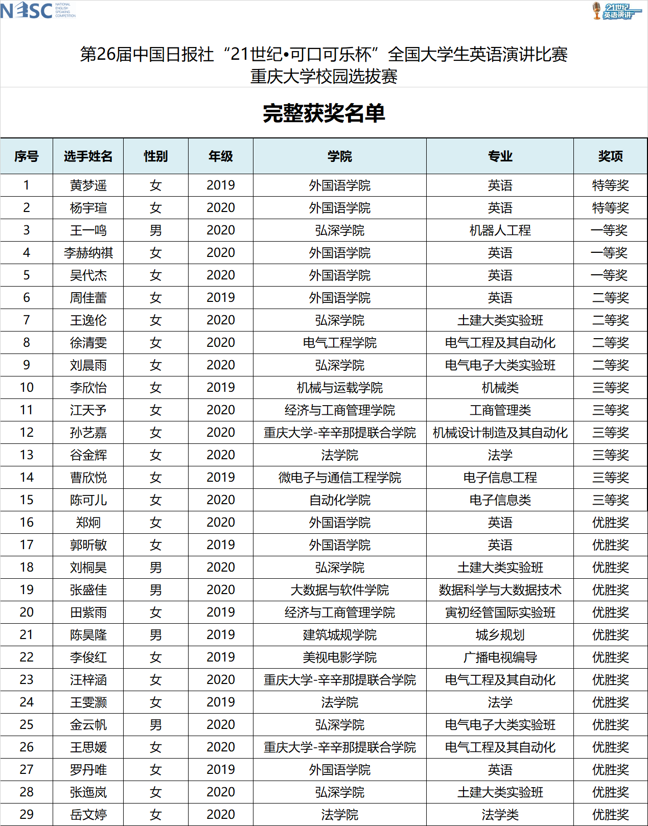 第26届中国日报社“21世纪•可口可乐杯”全国大学生英语演讲比赛获奖名单公示