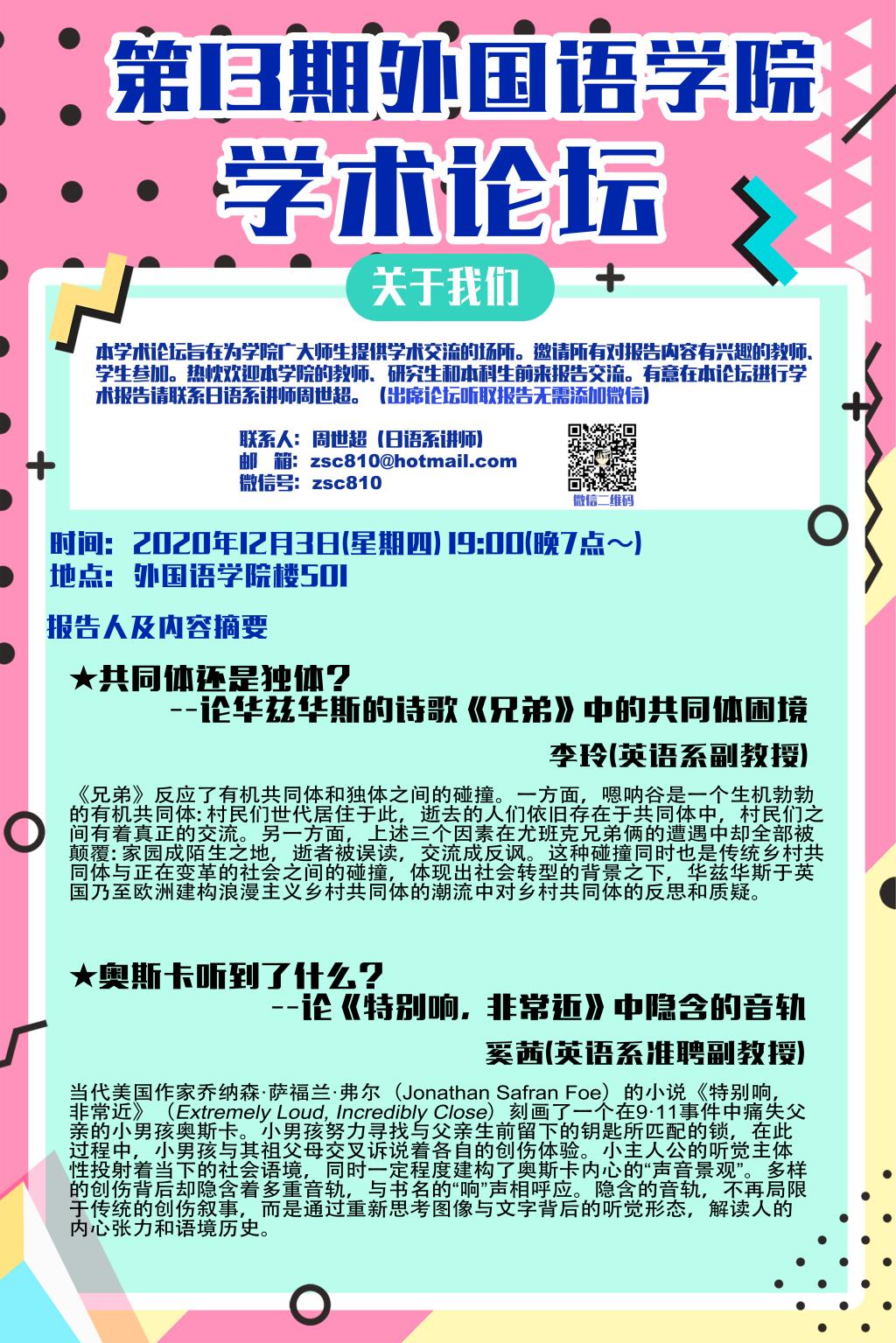 第13期跳蛋视频 学术论坛将于12月3日(周四)晚7点在跳蛋视频 楼501举办。本学术论坛旨在为学院广大师生提供学术交流的场所。邀请所有对报告内容有兴趣的教师、学生参加。有意在本论坛进行学术报告请联系日语系讲师周世超。详情请参见海报。