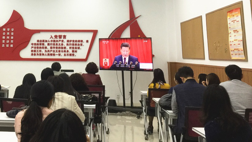 上午9点,行政支部党员们早早来到外语学院楼105党员活动室收看十九大开幕会现场直播。聆听、学习总书记的报告,不少在场党员都表示心潮澎湃,特别激动,“感觉党就在身边,总书记就在身边。”大会“不忘初心、牢记使命”的主题对大家也是一种鞭策和激励。报告全面总结了过去几年所取得的成果,准确分析了当今国内国际形势,并对中国未来发展提出了新的美好愿景。大家均表示本次报告内涵丰富、思想深刻、高屋建瓴、催人奋进,令人倍感自豪。