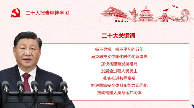 最后,主持人对今天所学习的内容进行了总结陈述。通过学习与探讨,同学们加深了对二十大精神的认识,得到了更多的感悟。在全球化的新时代,当代大学生更要深刻领会中国特色社会主义现代化的时代特征和实现路径,学有所思、思有所悟、悟有所为,为实现中华民族伟大复兴中国梦担起责、挑起担。