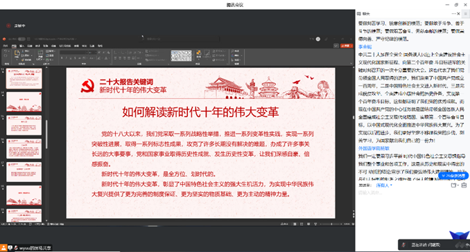 在主持人的带领下,同学们一起观看了二十大的学习视频以及相关报道,加强了对二十大会议主题及二十大精神的认识与感悟。在探讨二十大报告关键词的环节当中,同学们在主持人的带领下重温了二十大报告中的六个关键词:大会的主题、新时代十年的伟大改革、三件大事、中国式现代化、坚持和完善“一国两制”推进祖国统一、五个必由之路。