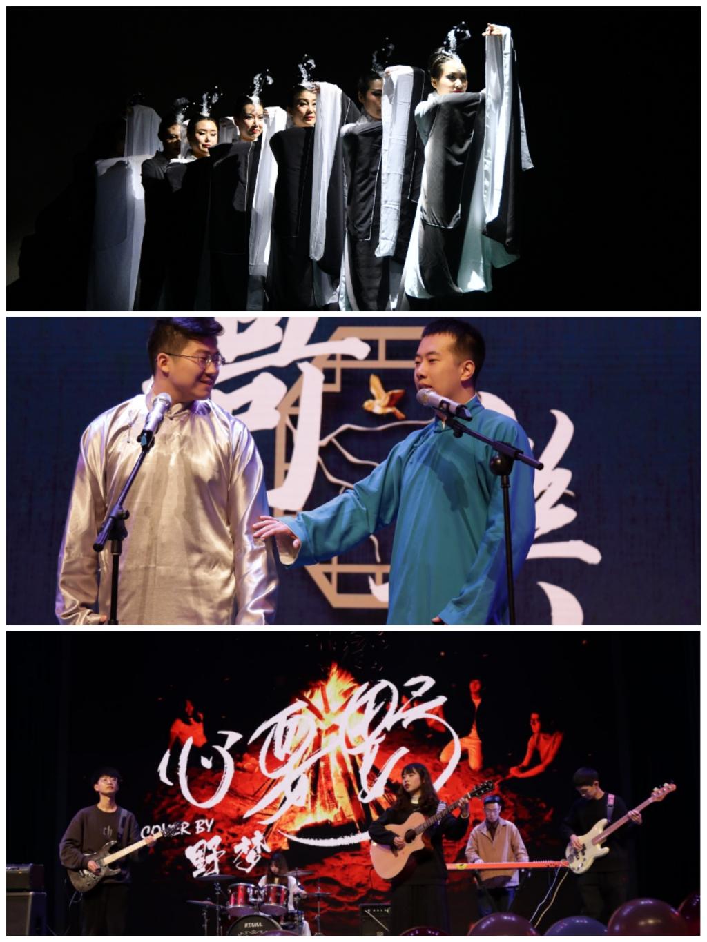 研究生演奏的《心要野》彰显出了青年学子蓬勃向上、热血沸腾的朝气与活力,为同学注入奋力追求理想的活力。哥乐相声社的王浩天和裴嘉成两位同学表演的相声《卖估衣》,展现出了伶俐的口才与独特的幽默,为观众带去欢声笑语的同时,也让大家了解到中国民间更多的传统文化与社会风俗。