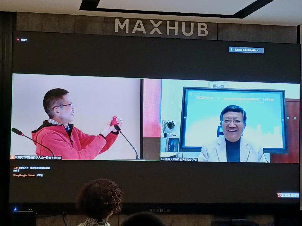 云南省大学外语教学研究会会长尹明教授代表2022年十省、市、区会议承办方发言,他热情地向十省、市、区的大学外语教师发出邀约,欢迎大家来年踊跃参会、交流经验、分享学术成果。会议最后,重庆市大学外语教学研究会会长余渭深教授和云南省大学外语教学研究会会长尹明教授在云端进行了十省、市、区大学英语教学研讨会印章的交接仪式。