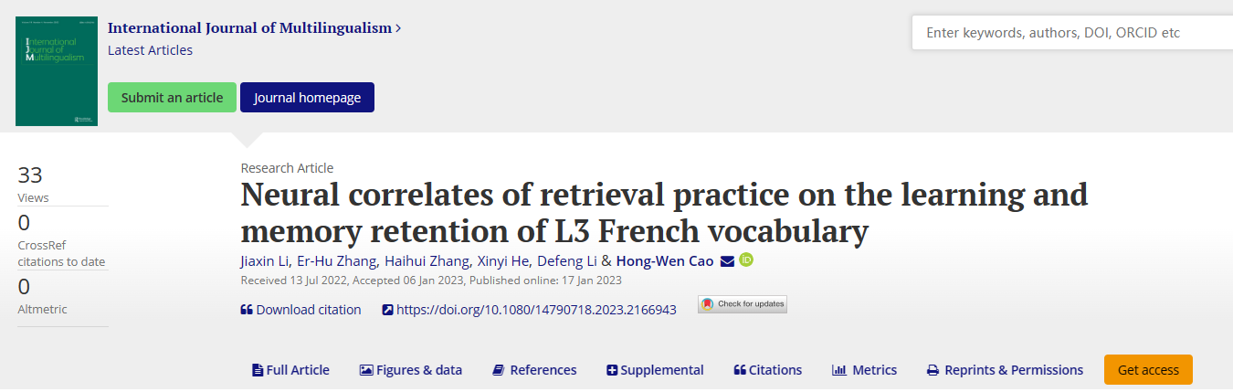 近日,我院曹洪文老师团队在英国泰勒-弗朗西斯出版集团(Taylor & Francis Group)旗下国际多语现象研究领域顶级期刊《国际多语期刊》(International Journal of Multilingualism,SSCI和A&HCI双检索,Q1)上发表题为“Neural correlates of retrieval practice on the learning and memory retention of L3 French vocabulary”的研究论文。该论文第一作者为我院语言认知与脑科学方向2020级博士生李佳欣,通讯作者为跳蛋视频